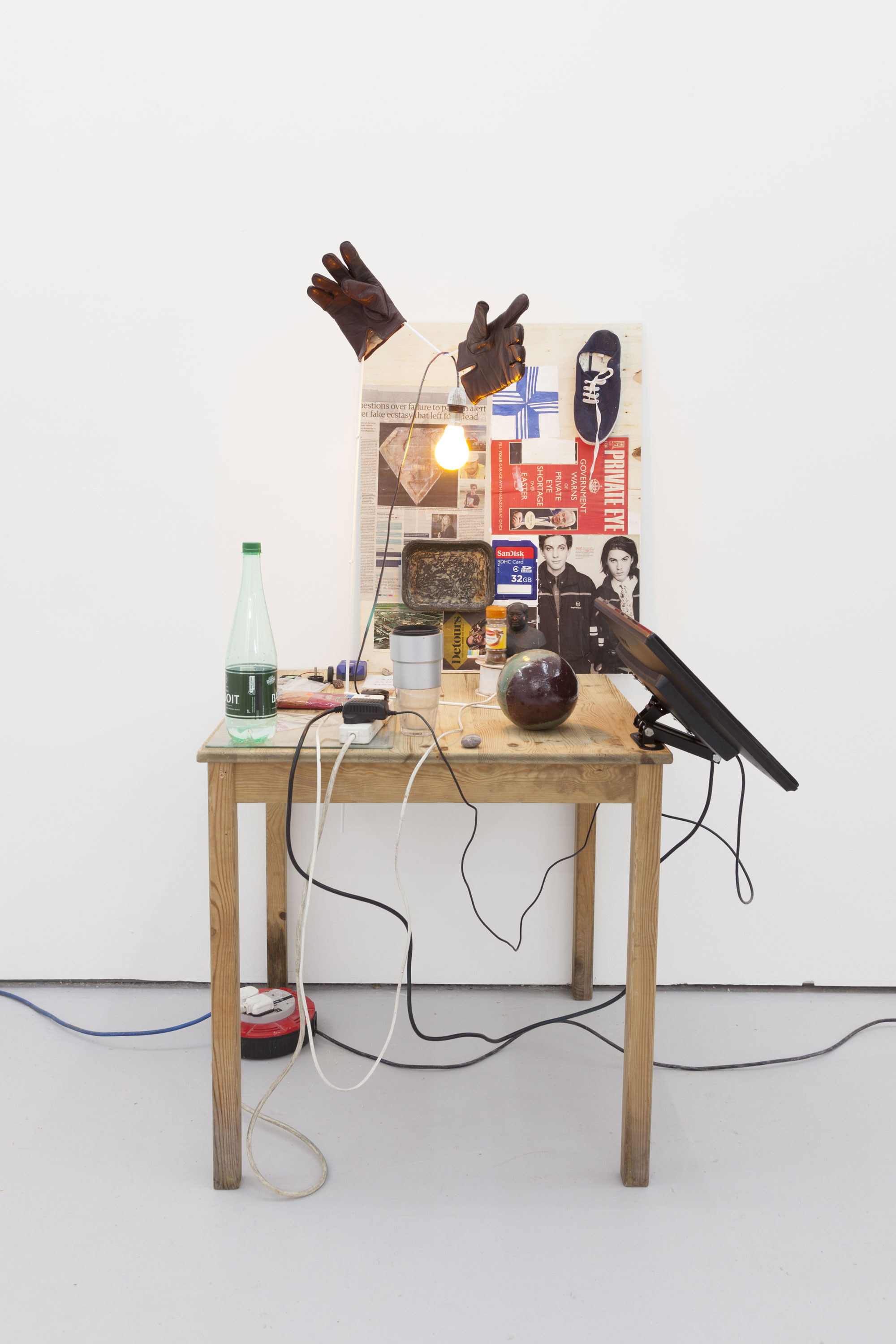 found ikea table, glass cutting board, laminated flower and leaf, 4-gang extension, bag of paprika, bag of mixed coins, computer fan, screw, volcanic rock from Stromboli, piece of berlin wall, small plastic fixings, glass tumbler, projector lens, display motor, "Chairman Mao" model, jar of cinnamon, used toothbrush, beach rock, glazed ceramic sphere (by Angharad Williams), "Badoit" water bottle, 21" monitor with bracket, 3:15min HD video, plastic coated metal, leather gloves, "bug light" bulb with fixings, mixed media collage on plywood
